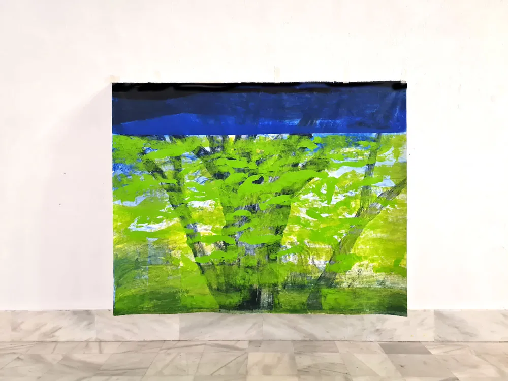 Open Air MV24 was conceived as a practical exercise at the Espacio de Cultura Contemporánea de Cádiz (ECCO) to explore the differences between digital visuality and pictorial materiality, through MECA Mediterráneo Centro Artístico. The project started from an image worked on-screen, with its luminous and chromatic qualities typical of the RGB environment, which was transferred to canvas using acrylic.